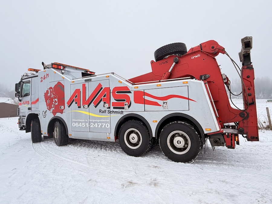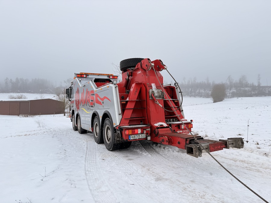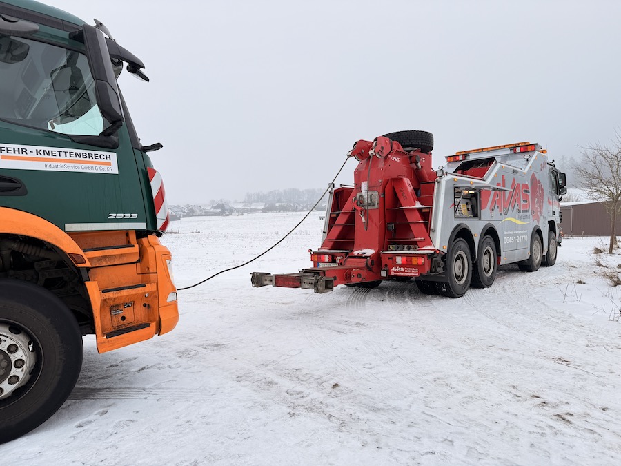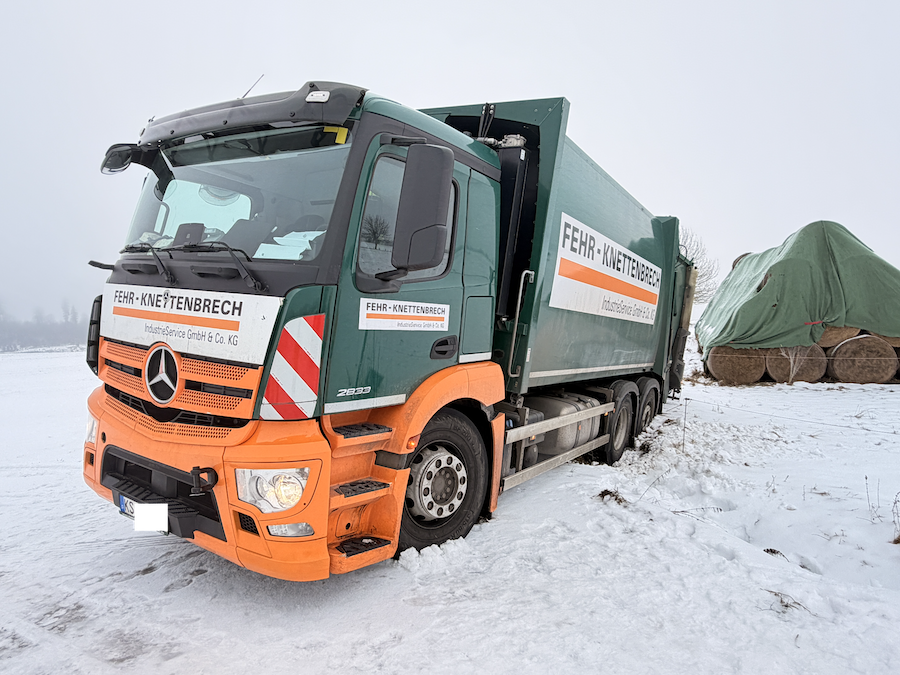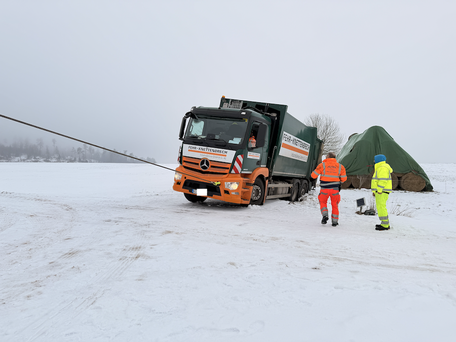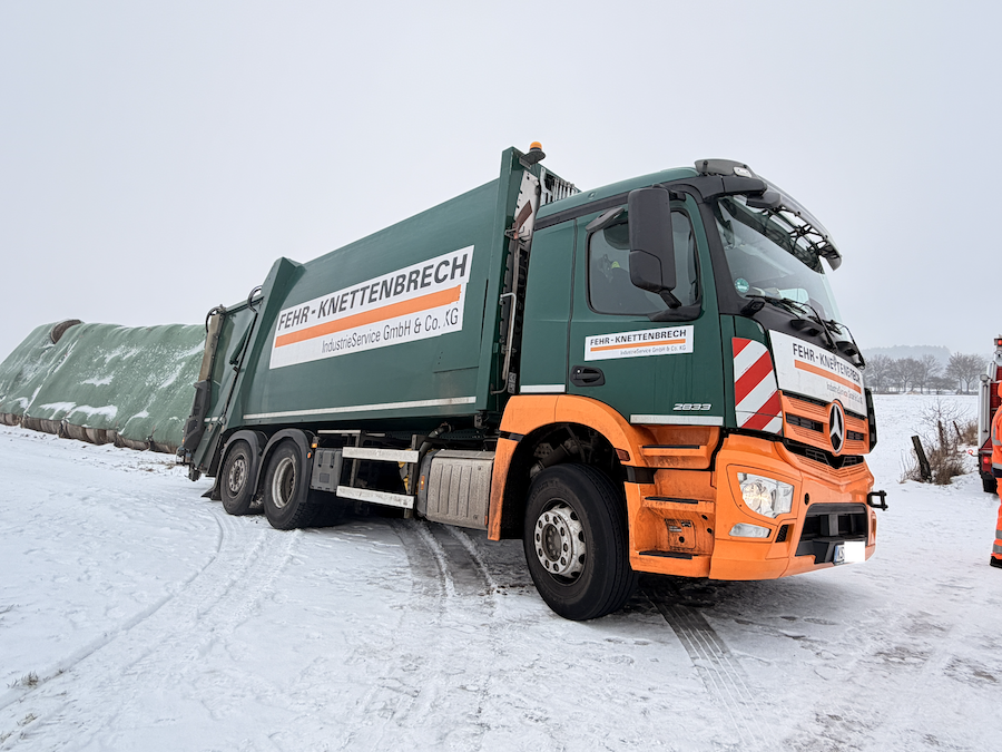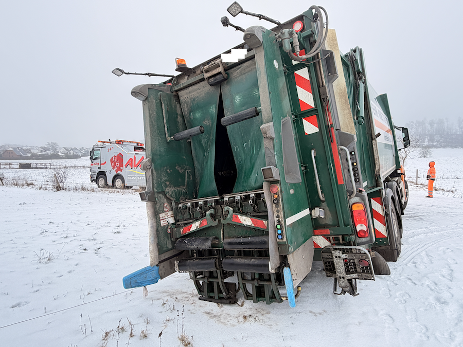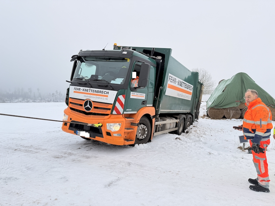 Zur Unterstützung rückte Ralf Schmidt, Inhaber der Firma AVAS, mit seinem 40 Tonnen schweren Bergefahrzeug an die Einsatzstelle aus. Um den Mercedes sicher aus seiner misslichen Lage zu befreien, setzte er eine der beiden am Fahrzeug verbauten Seilwinden ein. Diese weist eine enorme Zugkraft von 20 Tonnen auf, was völlig ausreichte, um den tonnenschweren Müllwagen präzise und behutsam zurück auf die befestigte Straße zu ziehen. Nach nur 15 Minuten war der routinierte Einsatz bereits erfolgreich beendet, sodass das Entsorgungsfahrzeug seine Tour ohne weitere Verzögerung fortsetzen konnte.